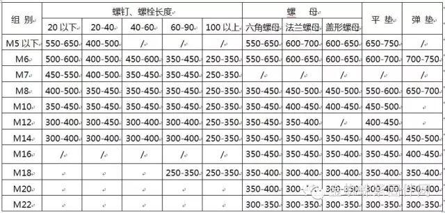 為了消除氫脆,一般采用鍍后熱處理,使氫逸出。溫度越高時間越長,除氫越徹底,但超過250℃鋅結晶組織將變形,發脆,耐蝕性明顯下降。實踐溫度:200±10 ℃,不同標準件產品除氫工藝見下表: