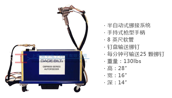 Gage Bilt自動鉚接工作站可安裝直徑3/32”-1/4”所有材質(zhì)鉚釘 Gage Bilt GB8000系列半自動鉚接系統(tǒng)應用一個手持式槍型鉚接工具。此工具由一根8英尺長的管與工作站連接。釘盤里的鉚釘在氣壓的作用下通過送料器自動被輸送到槍嘴。然后通過真空系統(tǒng)被拉入工具內(nèi),同時排出廢釘桿。此裝置需要110psi真空氣壓、最小80psi和10CFM的壓縮氣體。它每分鐘可輸送25顆鉚釘。